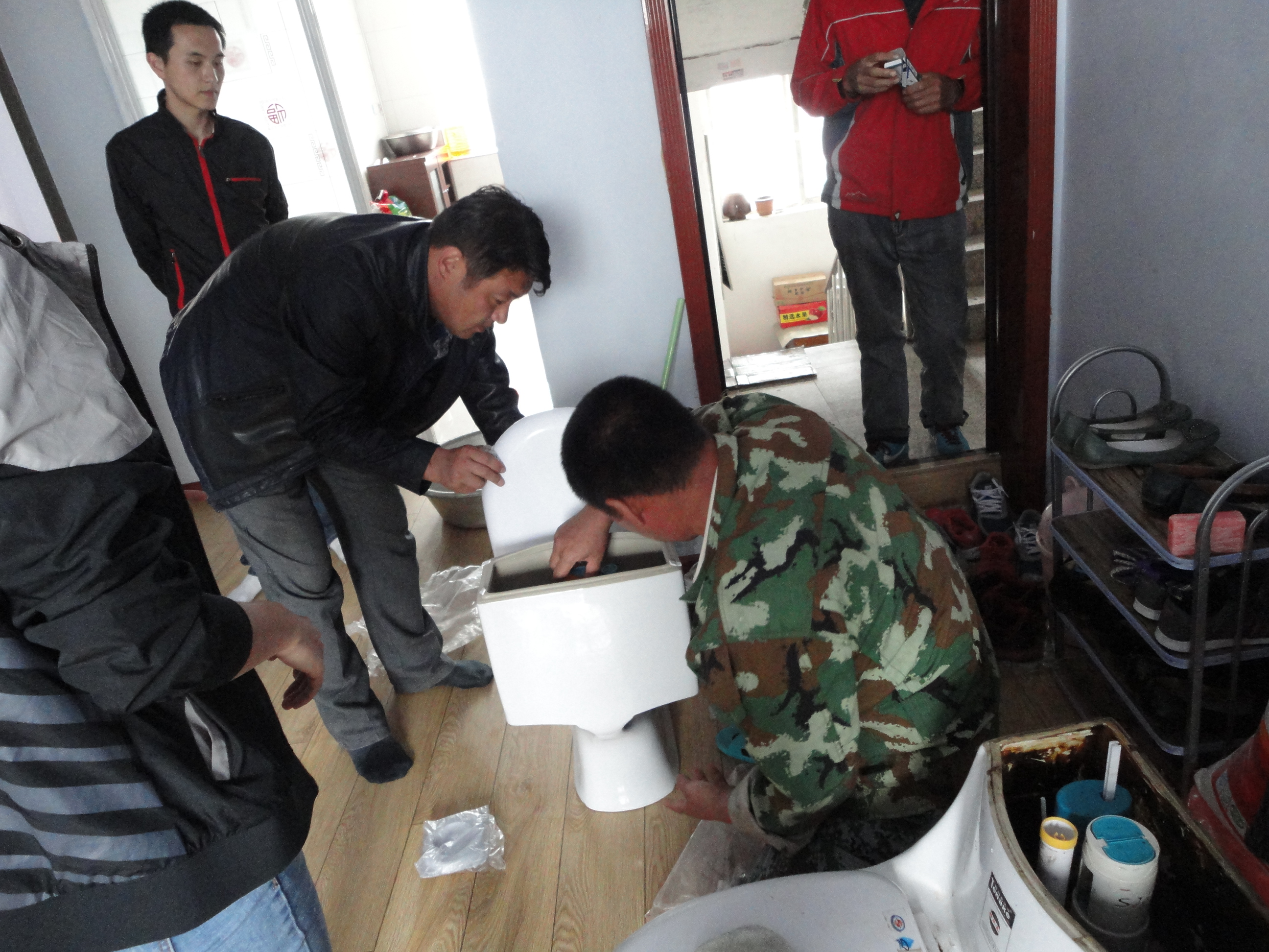 了解情況后,為盡快解決居民煩惱、社區(qū)人員第一時間聯(lián)系了轄區(qū)派出所民警,共同找到了502室居民的親屬,并把402室家中出現(xiàn)的情況及想法傳達給了其親屬,然后找來維修人員把坐便存在的隱患、故障全面進行了維修,并交代502室居民由于膠沒干透,24小時內(nèi)不能使用和挪動馬桶等事情。維修后,社區(qū)工作人員幫助居民清理了維修垃圾并打掃干凈了衛(wèi)生間。本以為事情順利解決,可沒想到第二天一大早,社區(qū)韓于蘭主任再次接到了402室居民的電話,說經(jīng)過昨天的維修,并沒有解決漏水問題。后來經(jīng)過了解,才知道原來是由于502室居民精神狀況出現(xiàn)了異常,挪動了坐便,導致本已維修好的坐便再次出現(xiàn)了漏水的現(xiàn)象。了解了情況后,社區(qū)韓主任再次聯(lián)系轄區(qū)派出所民警共同與502室親屬協(xié)商維修辦法,經(jīng)過協(xié)商,為徹底杜絕漏水現(xiàn)象的再次發(fā)生,502室居民親屬決定買個新坐便,同時希望社區(qū)再次幫助維修。社區(qū)韓主任通過社區(qū)志愿者登記表聯(lián)系到了環(huán)境衛(wèi)生管理中心黨支部書記裴云雷,在聽完韓主任的講述后,裴書記二話沒說馬上找來了自己的同學、馬桶專業(yè)維修人員劉秉春,利用了6月30日一上午時間對502室居民家的馬桶進行了更換。拆卸、安裝、搬運、抹膠、汗水濕透了志愿者們的衣襟,經(jīng)過大家的共同努力,3個小時后,新馬桶安裝完畢,一直壓在402室居民的心病終于解除了,當社區(qū)韓主任要給專業(yè)維修人員劉秉春維修費用的時候,被他婉言謝絕了,他表示,誰遇到這種情況、這種家庭都會伸出援助之手。